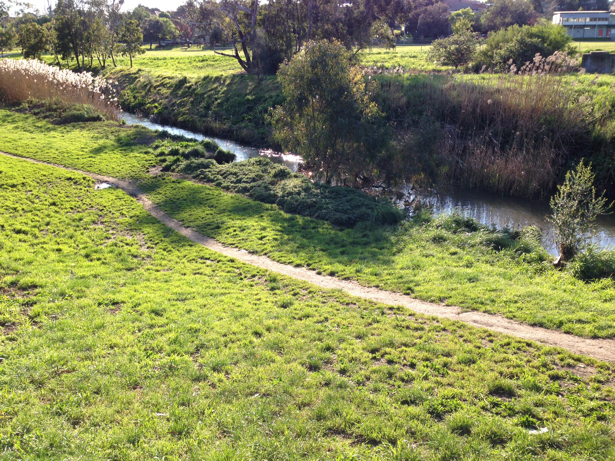 Martin scrambled up a rocky rise. Twisted pieces of metal and old bluestone cobbles poked out of the creek bank below. The water was green and high with the rain. On the other side a soccer field stretched to a hill where more houses rose up the gentle undulation among trees.